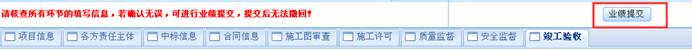 建筑企业通过业务录入系统准确完整填报了工程项目信息并上传必要的附件材料,业绩备案列表中所有信息填写完成并检查无误,点击“业绩提交”(图19所示),并到项目所在地住房城乡建设行政主管部门提出书面入库申请材料,主管部门收到书面申请后应在3个工作日审查是否同意入库,同意入库后将进入全省统一的企业业绩数据库,同时进入 “全国建筑市场监管公共服务平台”(即“四库一平台”),已通过的工程业绩不能擅自修改,并永久向社会发布,接受社会监督。备案通过的业绩即可在资质管理系统业务申报中作为有效业绩选择使用。
