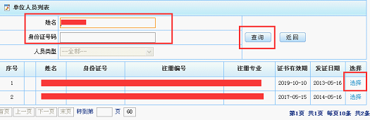 选择企业类型后,点击“确定”按钮,弹出图8所示录入界面,点击“添加”按钮选择企业,点击 “选择”按钮添加所需资质。单位信息填写完成后,点击“保存”按钮,然后点击人员信息“新增”按钮,进入项目人员填报界面(图9所示)。在人员填报界面选择人员类型后,点击“添加”,输入姓名或证件号等查询条件,查询到所需人员并点击“选择”即可(图10所示),“选择”功能只能选择本单位人员,所选人员核心信息不能修改。如果该项目参与人员现已调离本单位,则需先勾选“已调出人员”,此时因该人员已不在本单位,“添加”功能失效,只能手动填写人员信息,并上传相关调出证明(图11所示)。