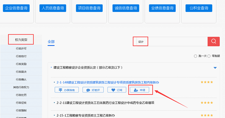 以设计企业登录为例,在以上前两个页面先后点击“直通部门”、“住房城乡建设厅”,然后在第三个页面搜索具体的资质类办理事项关键字“设计”,最后点击【申请】按钮并在第四个页面确认业务类型为“设计”后,进入设计企业版如下图所示: