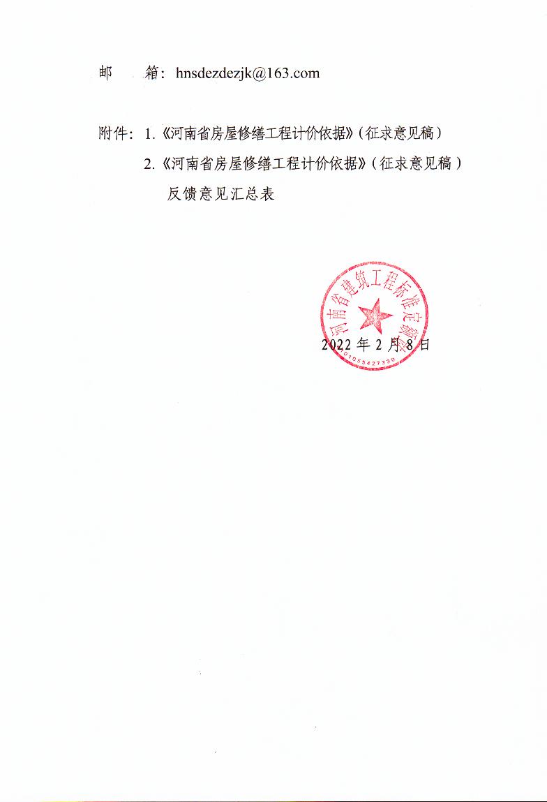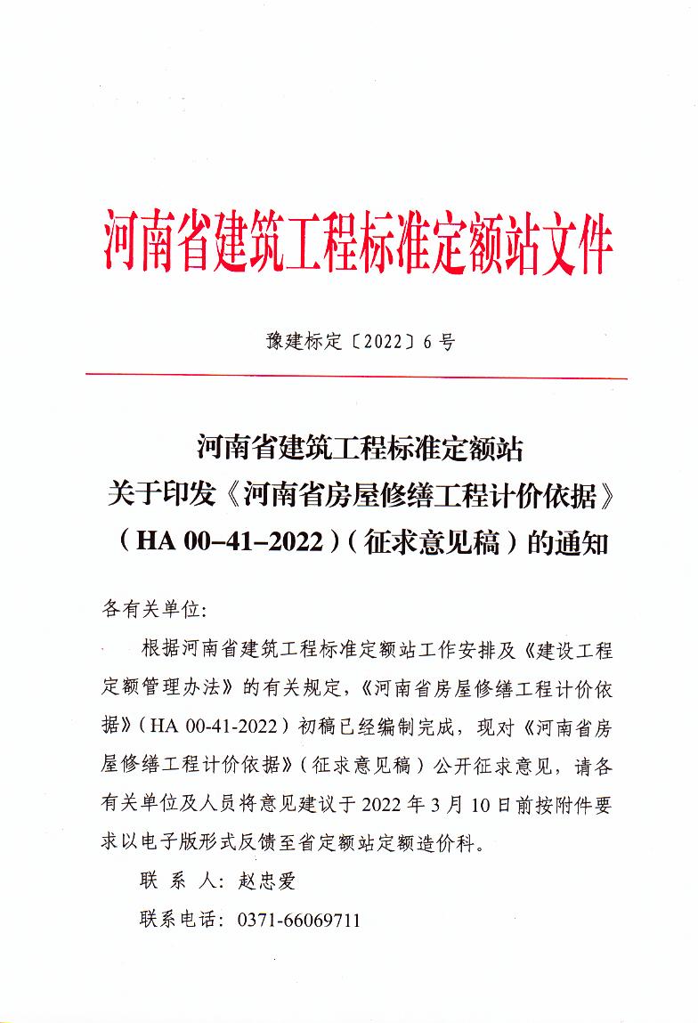 河南省建筑工程标准定额站 关于印发《河南省房屋修缮工程计价依据》(HA 00-41-2022)(征求意见稿)的通知