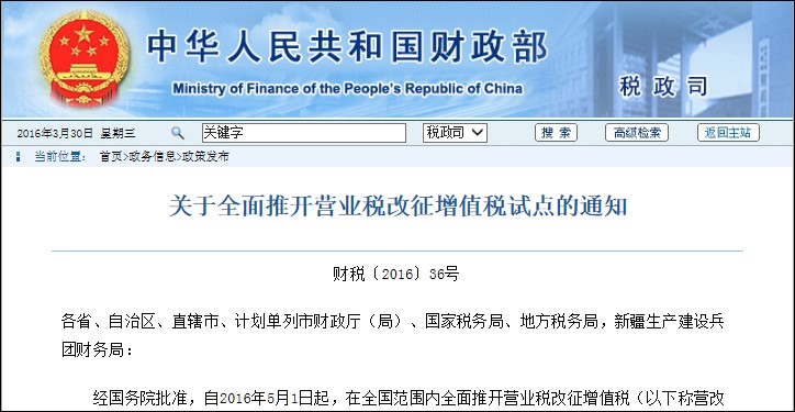 2016年3月23日,财政部 国家税务总局正式发布《关于全面推开营业税改征增值税试点的通知》财税〔2016〕36号
