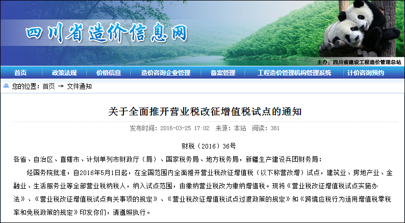 3月25日,四川省造价信息网转载财政部 国家税务总局 财税〔2016〕36号文,《关于全面推开营业税改征增值税试点的通知》