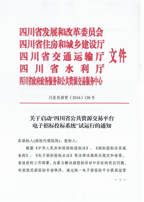 转:川发改招管〔2016〕128号 关于启动“四川省公共资源交易平台电子招标投标系统”试运行的通知