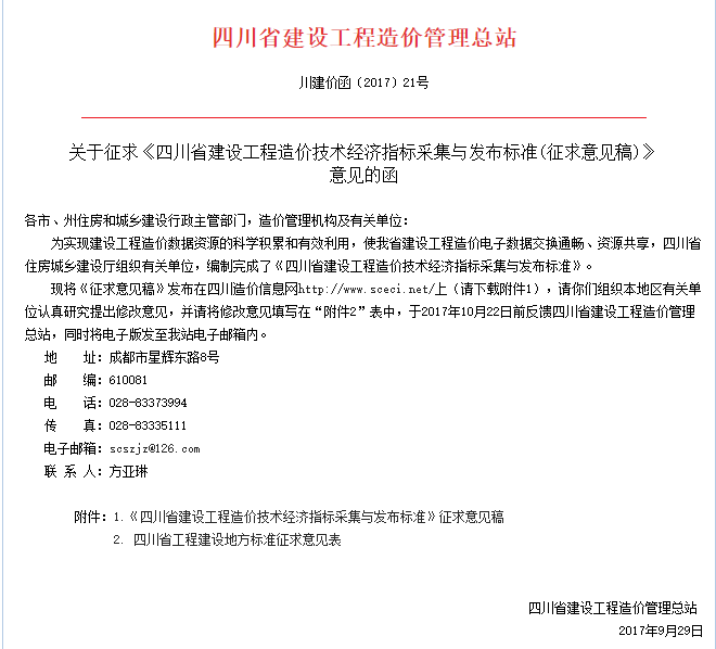 川建价函〔2017〕21号 关于征求《四川省建设工程造价技术经济指标采集与发布标准(征求意见稿)》 意见的函