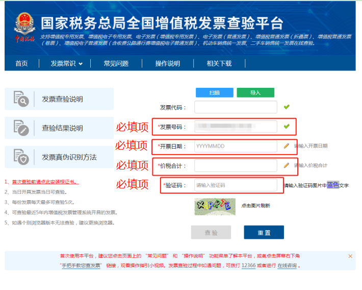 第三步:在红框处输入对应发票信息,点击“查验”即可。