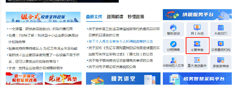 第二步:首页向下滑动,找到“纳税服务平台”模块,点击“发票查询”进入国家税务总局全国增值税发票查验平台。