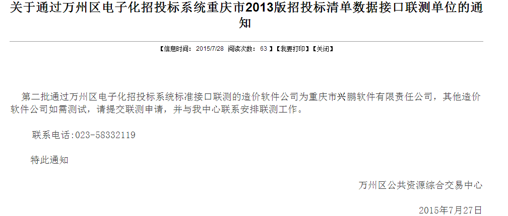 热烈祝贺鹏业软件关于通过万州区电子化招投标系统重庆市2013版招投标清单数据接口联测