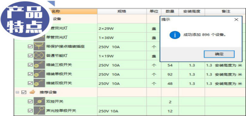 软件自动识别设备表并与平面图的设备进行匹配,一次性地完成各种安装设备数量的分类统计。在实际图纸中,设备图例表中的图例并不完整,很多需要统计的设备图例表中并没有包括,软件将其放置推荐设备或未知设备,根据实际情况选取是否识别,以保证在统计设备个数时不会漏项。