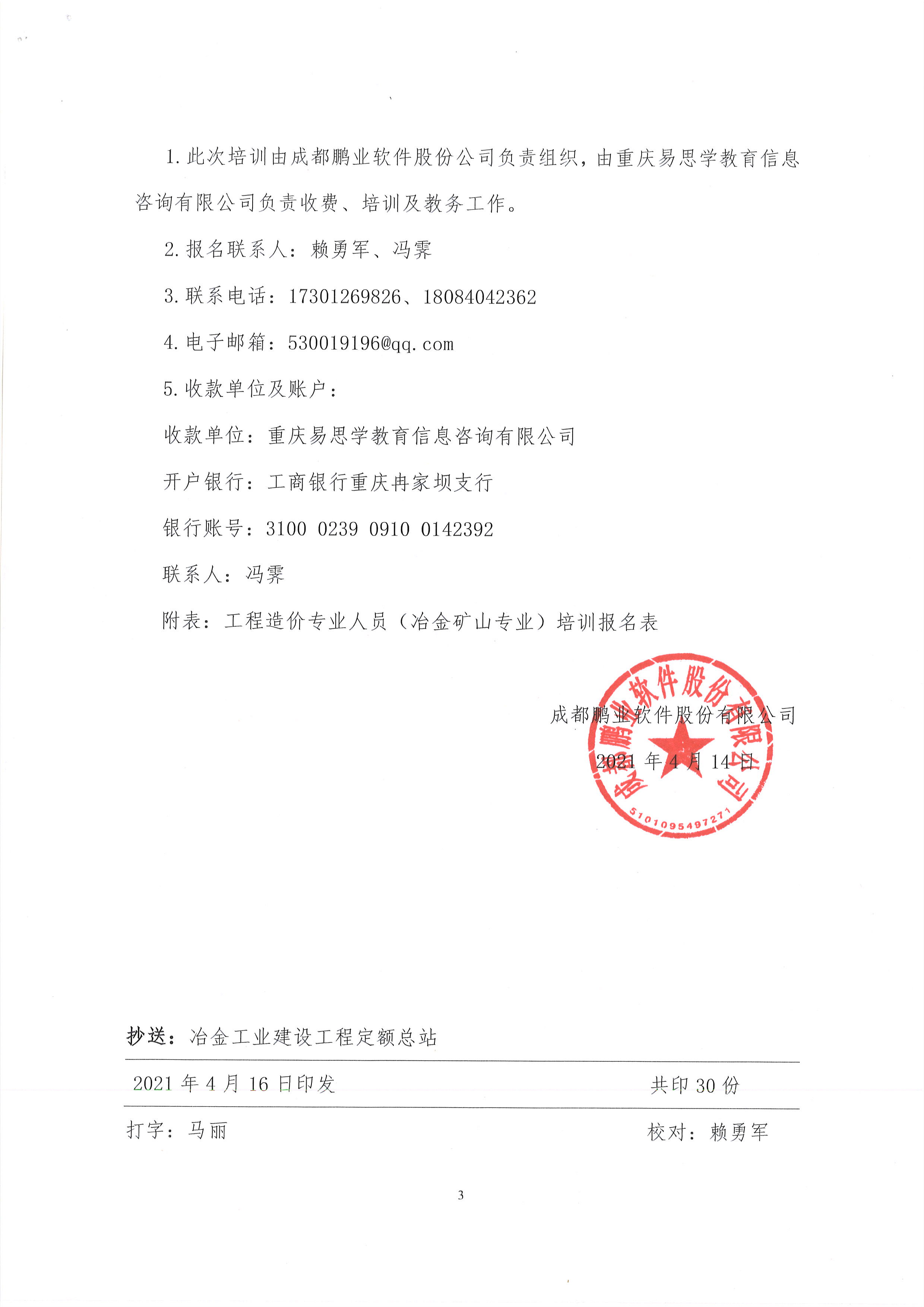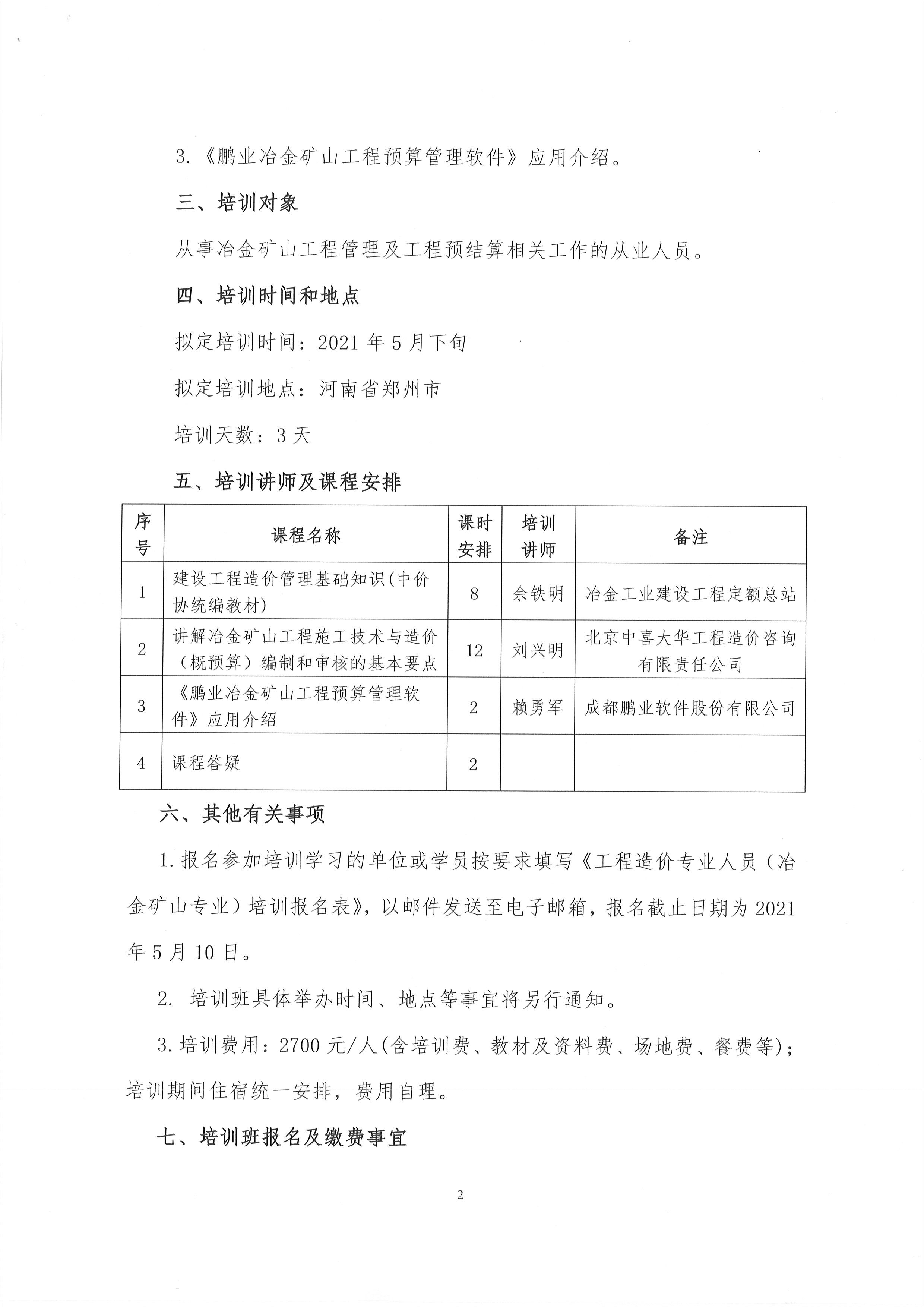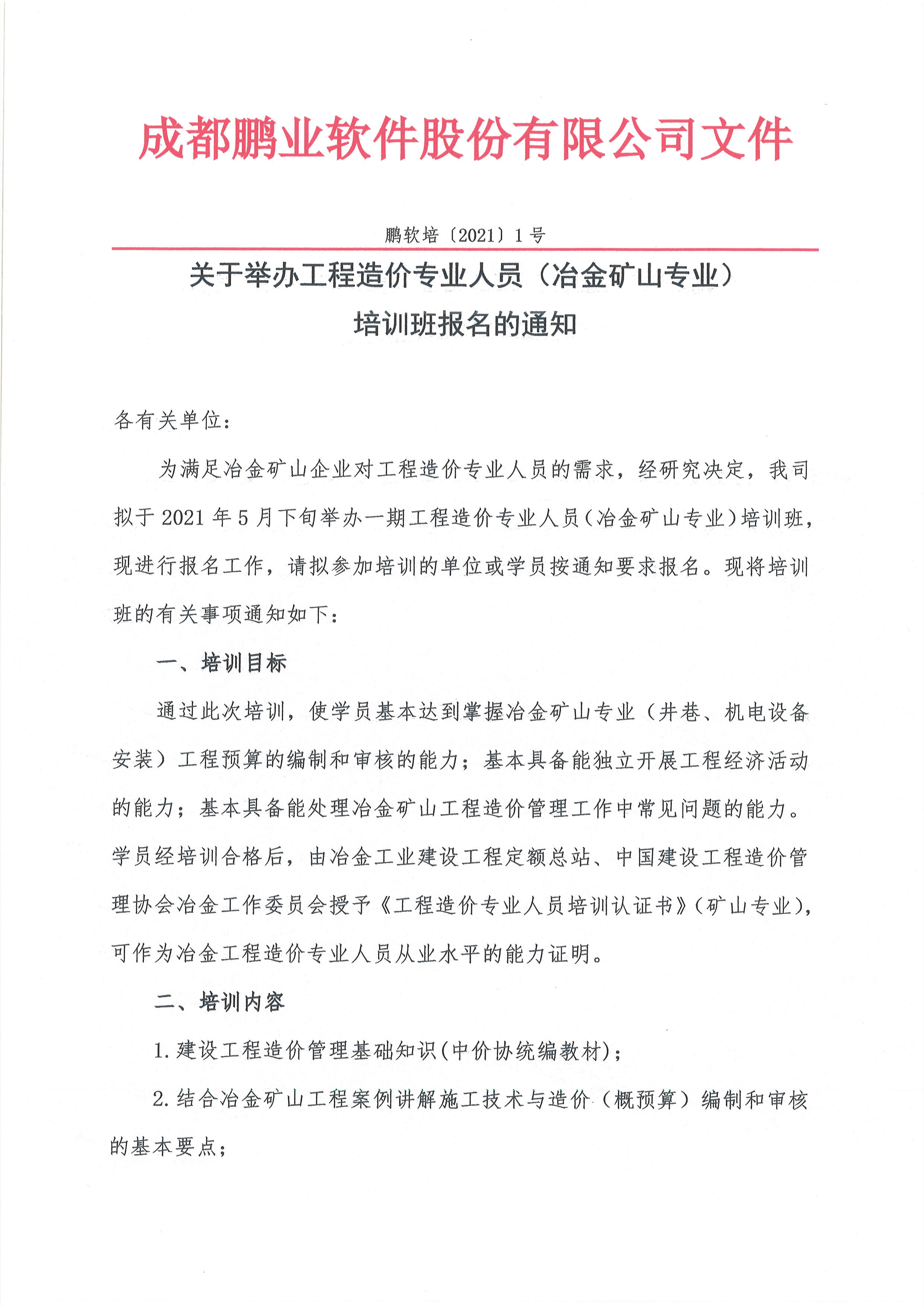成都鹏业软件股份有限公司根据矿山工程造价专业人员市场需求情况,拟举办一期工程造价专业人员(冶金矿山专业)面授培训班,从事冶金矿山工程管理及工程预结算相关工作的从业人员,可结合自身工作需要报名参加此次培训,具体通知如下: