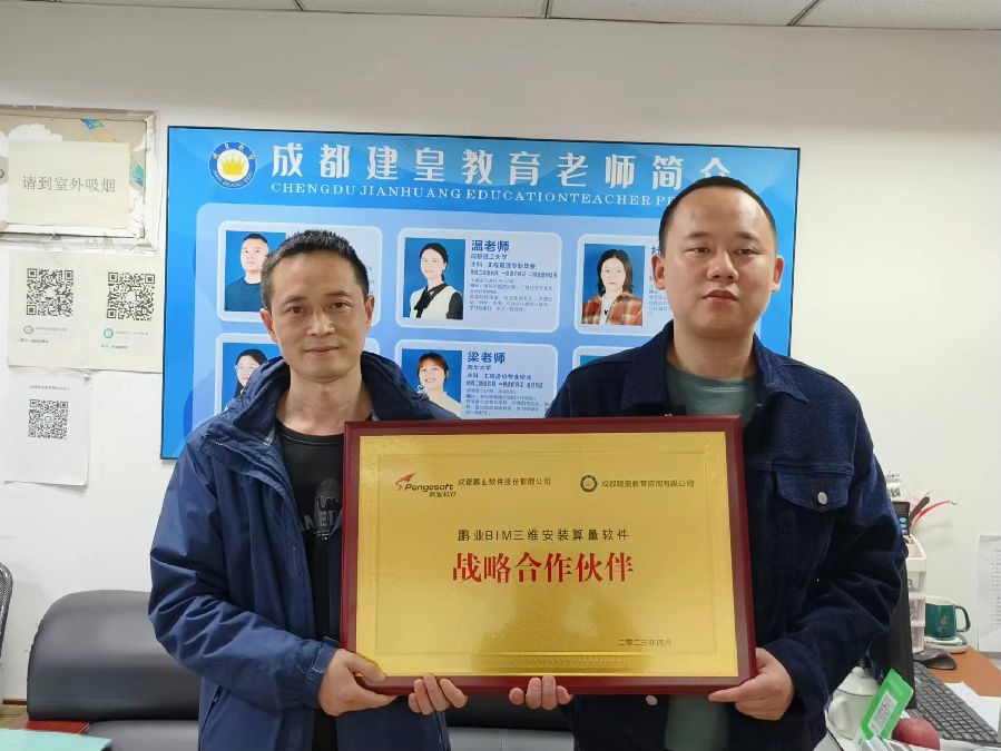 2023年3月28日,成都建皇教育咨询有限公司(简称“建皇教育”)与成都鹏业软件股份有限公司(简称“鹏业软件”)达成战略合作伙伴关系。建皇教育总经理陈小川、鹏业软件市场部总监黄剑出席了现场授牌签约仪式。
