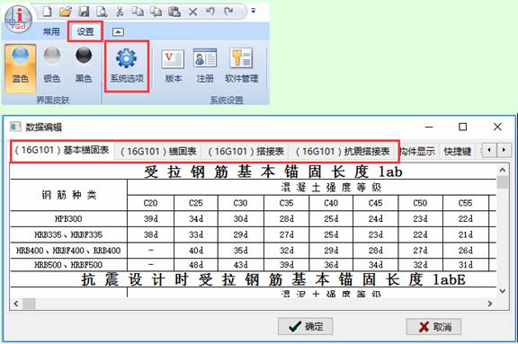 1.1. 新增16G基本锚固表(Lab/Labe)、锚固表(La/Lae)、搭接表(Ll/Lle),表格入口:【设置→系统选项】