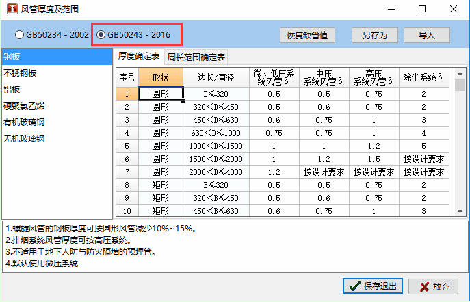 3. 新增2016风管范围及厚度表规范