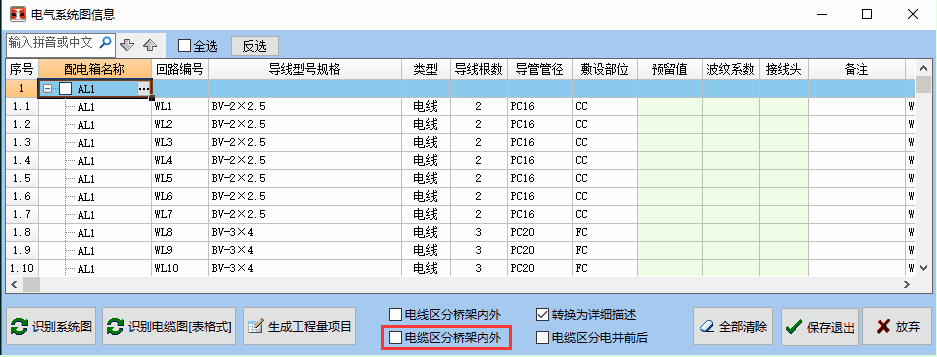 2. 电气系统表新增“电缆区分桥架内外”选项