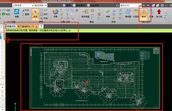3. 图纸调进去之后,进入到系统的主界面,本软件采用一键识别的功能处理喷淋系统。选择下图中位置1的一键识别喷淋按钮,每次操作都会出现图中2位置的提示。按照提示选择识别的区域,选择图中3位置的图纸区域,单击,进入喷淋模型界面。