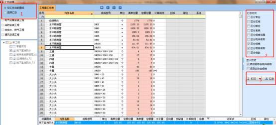 (6) 在汇总表中选择需要汇总的工程1,在右侧选择汇总显示的层次2,最后可以打印输出3。如下图。
