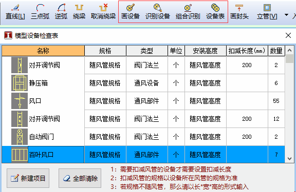通风一键识别时,会自动识别设备图元,用户可以在模型设备检查表中进行增(识别和画设备等操作)、删、改等操作,编辑设备的属性后,生成工程量,可以一键生成设备及设备的扣减项目: