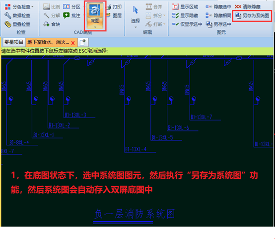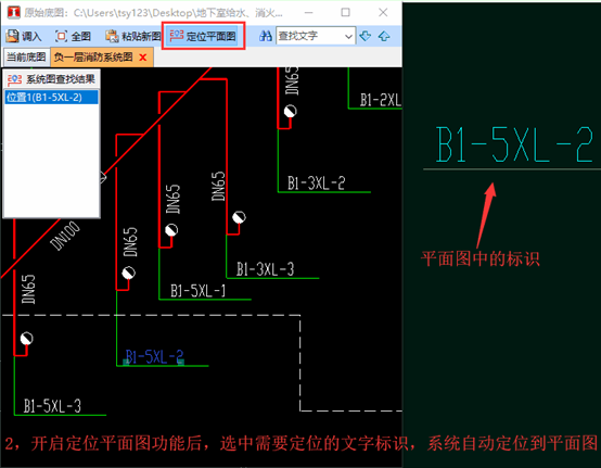 在实际工程中,我们通常需要反复查看某些特殊的底图,例如电气系统图,消火栓系统图,在将系统图和平面图进行比对时,经常因为图纸位置问题,来回定位,反复查找,非常浪费时间,“双屏底图文字定位功能”能快速的解决该问题: