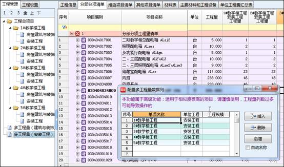 对于大型群楼工程,其大多数的单位工程项目具有清单相近、相似的特点,采用多工程量功能,可以便捷的对工程项目进行统一设置,在一个界面中实现多个单位工程同时组价,避免了重复操作的过程,极大的节省了完成工程时间。