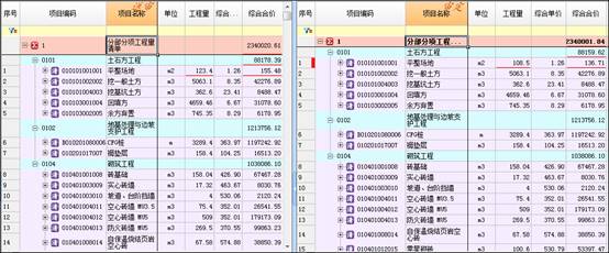 在预算通i9中,将当前正在编制的清单项目,与已完成并存储为文件的工程项目进行对比,对比内容包括编码、名称、单位、单价、特征等数据内容。用颜色标记有差异的数据内容,方便进行对应以及时修改。