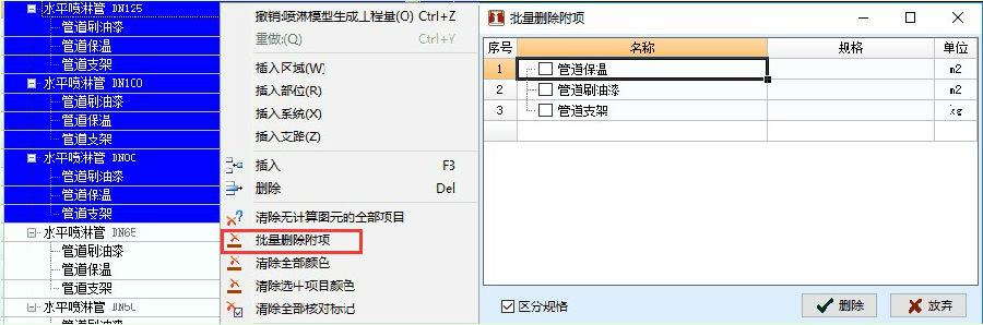 工程量表右键菜单中新增批量删除附项功能,选中项(按shift或ctrl多选),右键执行该功能,勾选需要删除的项即可;