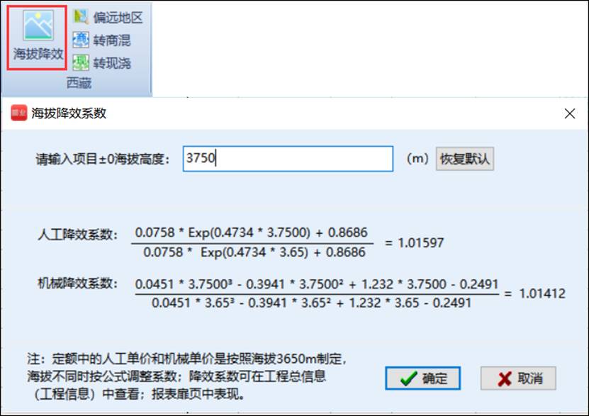 答:人工降效是指工人在高原、高空、复杂工作环境下,不能执行正常定额所发生的降低人工作业效率的客观现象;机械降效是指机械在高原、高空、复杂工作环境下,不能执行正常定额所发生的降低机械作业效率的客观现象;在西藏2016定额的总说明中列举了人工和机械的降效调整系数的计算方法和速查表;在软件应用时,应根据项目实际±0的海拔高度对定额的人工费和机械费费用分别乘以对应的系数,定额组成的人工及机械的耗量不做调整。调整方法如图示: