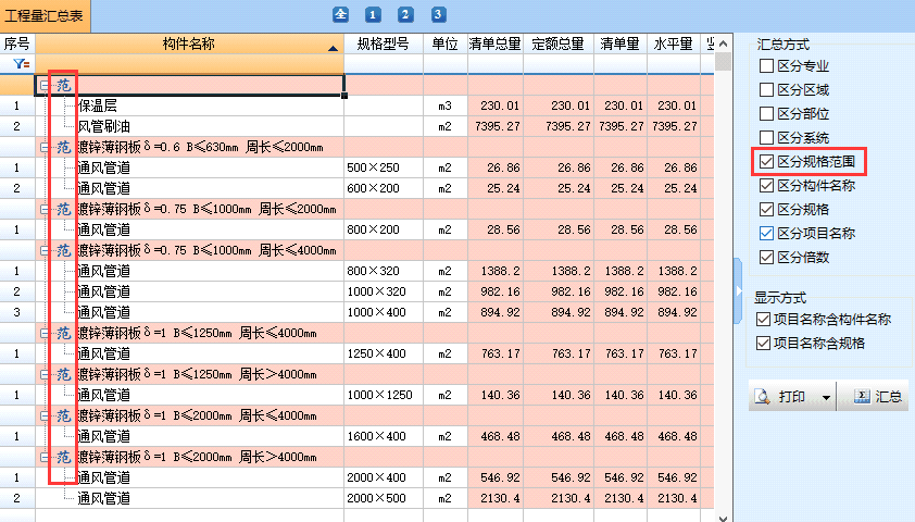 答:汇总方式中的区分规格范围这个选项是在通风管道汇总工程量的时候用到的,其他专业用不到。软件会根据风管的大边长或直径确定风管的厚度,再根据其周长范围进行汇总。如图: