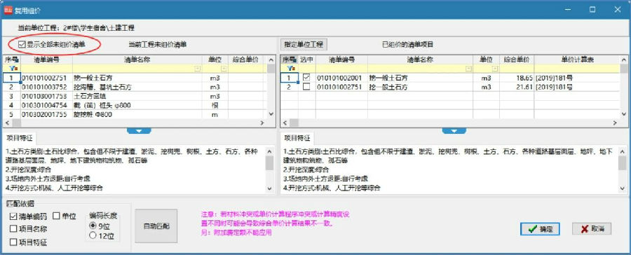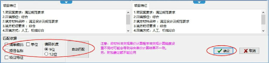 2、 选择“匹配依据”条件,然后选择“自动匹配”按钮,按“确定”即可完成组价。