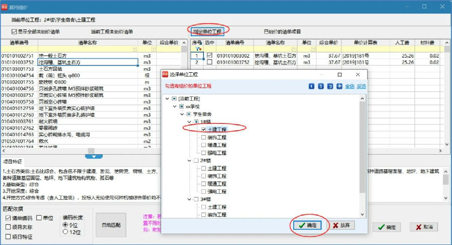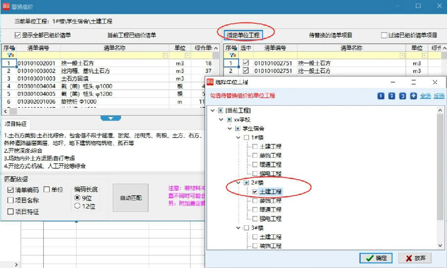 b) 如在众多单位工程中,勾选指定的待替换组价的单位工程,可以通过设置“指定单位工程”来实现;