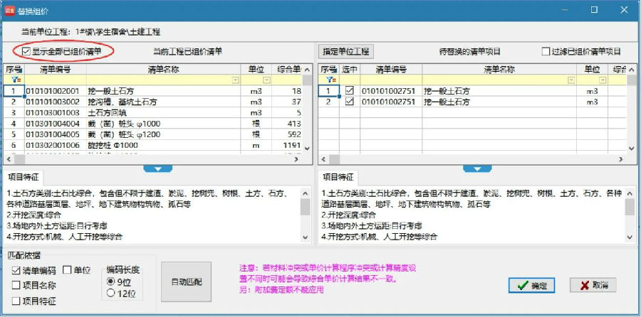a) 当要显示当前单位工程所有组价的清单,可以在“显示全部已组价清单”前打勾;