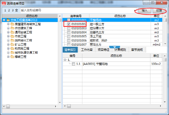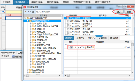 2、根据项目实际情况勾选相对应清单,然后选择插入/后增