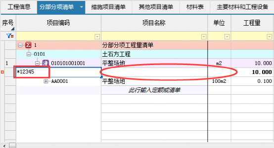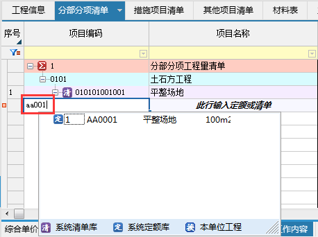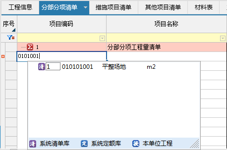 方式2:直接输入清单编号,如输入0101001敲击回车键,对应清单就录入好了;