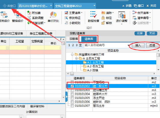 2、进入库,上方勾选清单,下面勾选定额,勾选好后选择插入或后增方式进行清单和定额的录入