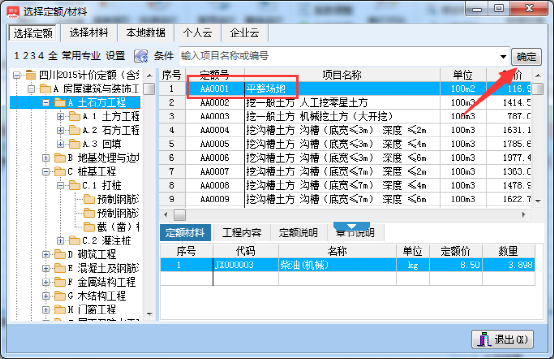 方式2:直接输入定额编号,如输入AA1--完成定额录入;