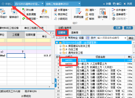 方式3:通过库窗口选择定额,找到对应定额,双击进行定额录入;