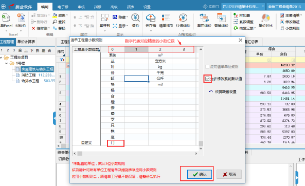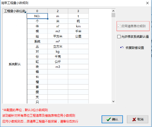 2.软件按工程量清单编制规则已经默认了常用单位的工程量精度,如要修改系统默认位数,在“允许修改系统默认值”打勾。自定义功能里可以自主添加相应单位对应的小数规则,确定即可。