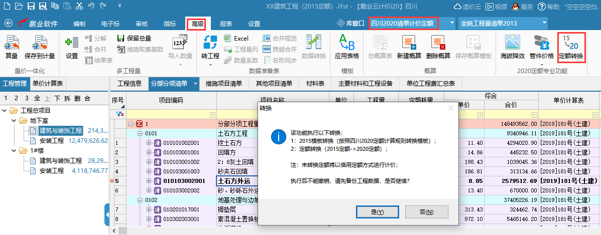 2. 在软件上方下拉将定额库切换成四川2020清单计价定额,然后在高级模块下方找到15-20定额转换功能。