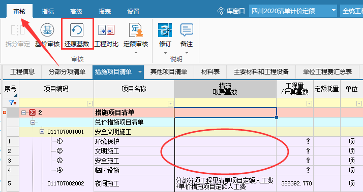 3.总价措施取费基数还原,在审核模块下方找到还原基数,点击,将总价措施取费基数还原。