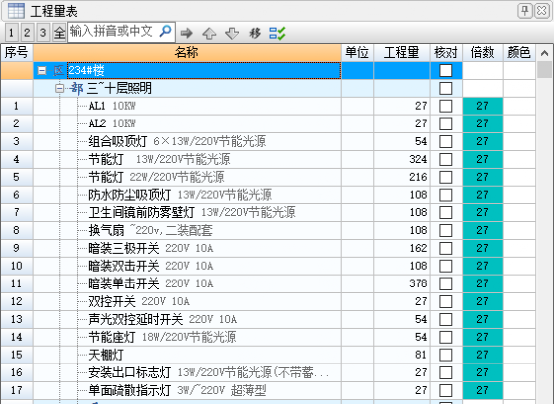 比如我们这里这里是以部位进行户型的区分的,计算完成后,按下Ctrl键不放鼠标单击部位层次,这个时候该部位下的项目全部选中了,选中后右键单击选中“批量修改工程量”命令,在弹出的“批量修改工程量”对话框中输入相应的倍数单击确定即可。设置完成后如上图,相同倍数的项目再软件中用同一种颜色提示,方便查看。