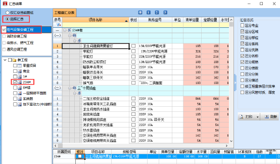 答:进入汇总表→选择汇总→可以通过下方的专业进行筛选,软件会根据调入图纸时所选择的专业进行筛选→筛选完成后选择需要汇总的图纸工程量即可。如图: