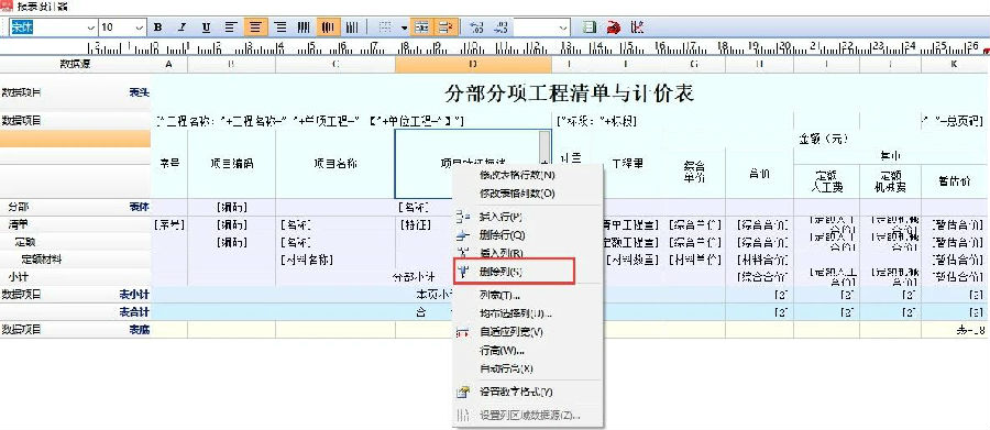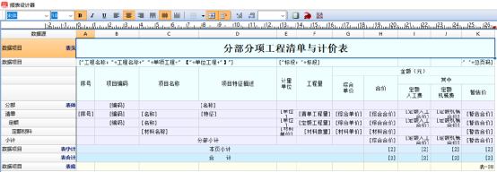 3.1 若软件所提供的默认报表样式不能满足工程招投标的需求,则可以通过右上方功能按钮进入到“报表设计”界面,如对“【表-08】分部分项工程和单价措施项目清单与计价表”进行自定义设计: