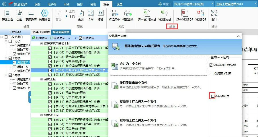 在输出功能区,可以将勾选报表导出EXCEL(PDF),选中导出EXCEL/PDF按钮就是批量导出选中报表,导出EXCEL/PDF按钮就是单张导出预览当前报表;导出的报表的时候可以选择输出方式和设置报表是否需要分页。