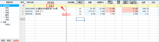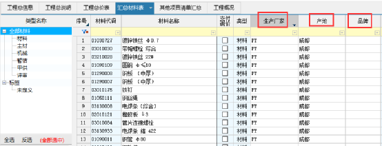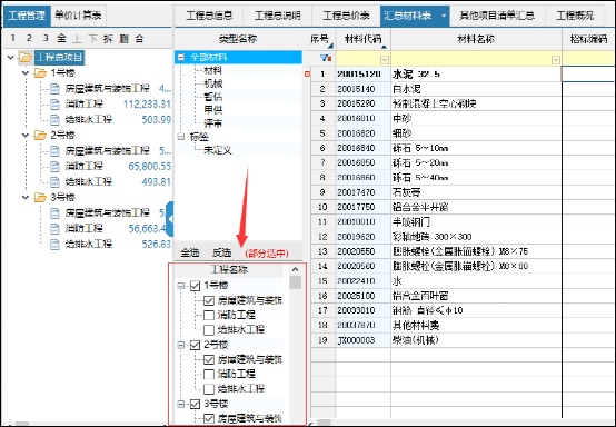 汇总材料表可以对整个工程的材料进行汇总统计,也可查看某几个工程的材料数据,通过汇总材料表左下方勾选需要统计的工程即可: