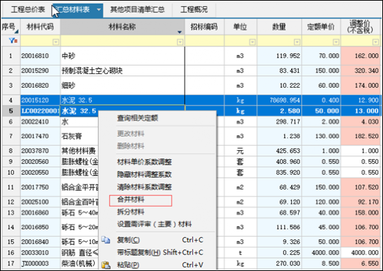 材料合并:在编制造价文件时,一个项目可能是由多人共同完成的,项目合并在一起的时候可能会出现有相同的材料,需要对相同的进行合并。