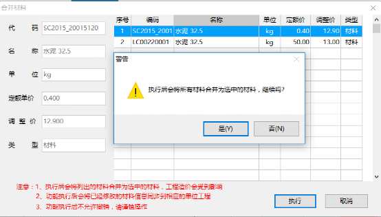 然后在合并材料窗口,选中需要执行的合并材料,执行即可: