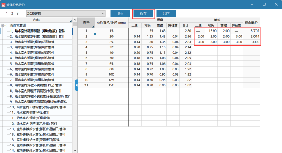 (2)在管件价格维护里面输入相应规格材料的单价并保存。