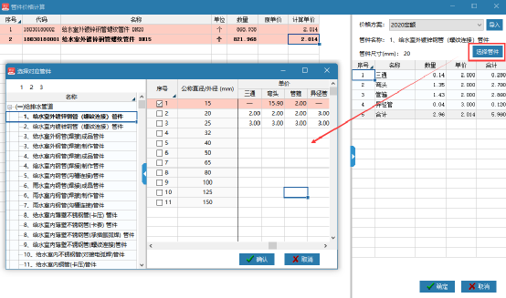 (3)在管件价格计算里除了软件会自动匹配相应的管件价格外,还可以手动点击选择管件勾选相应的价格进行调价。