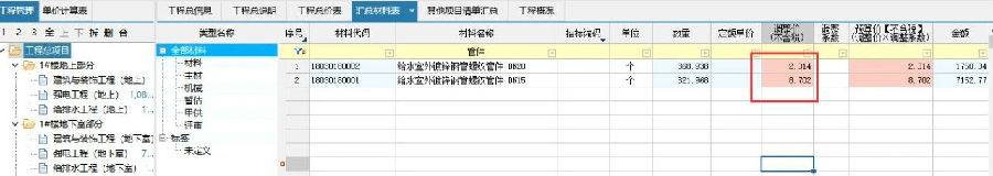 (3)在汇总材料表里选中需要应用管件价格的材料并在工具栏点击管件价格-管件价格应用。
