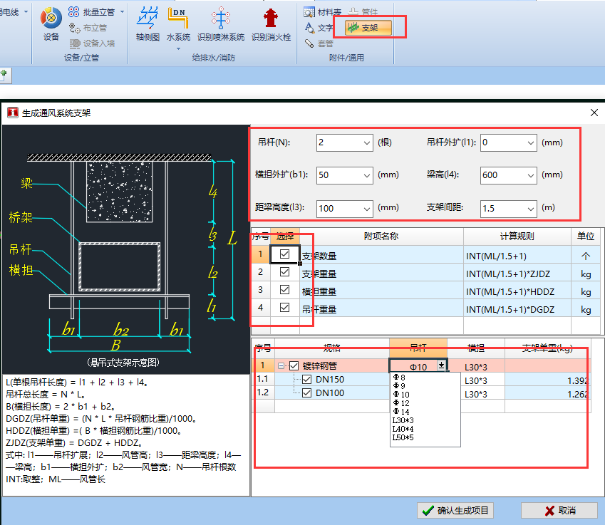 ②根据实际设置相关参数(吊杆和横担可以通过下拉去选择)