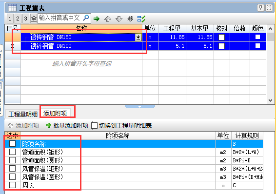 ②添加附项-附项选项里选需要的附项(如果没有需要的项可以这添加、修改其名称、单位、计算规则)