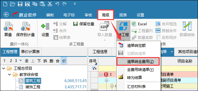 1.在工程结构树任意处点击“高级”—“转工程”—“清单转全费用”功能,如图示: